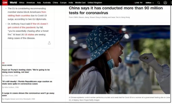 除了北京的新冠病毒核酸检测情况,美国有线电视新闻网还在24日对中国检测情况进行了报道,引用来自中国国家卫健委的说法,中国各地的医疗机构目前已经累计完成了9041万人次检测。