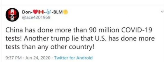 Don-BLM:中国已经完成了9000万人次新冠病毒检测!“美国是世界上进行检测数量最多的国家”,这是特朗普的又一个谎言。