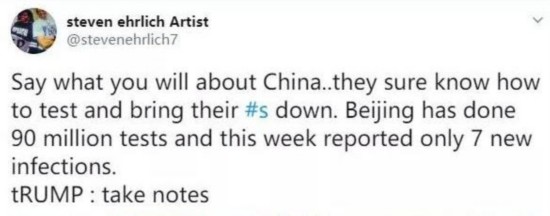 steven ehrlich Artist:中国当然知道如何进行检测并且减少他们的感染病例,中国已经完成了9000万次新冠病毒检测。特朗普学着点儿!