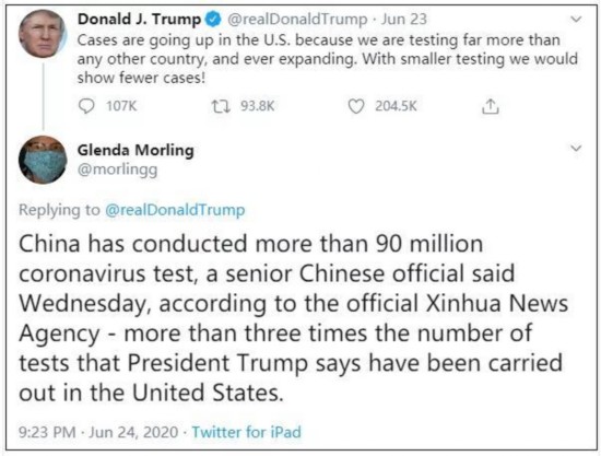 Glenda Morling:一位中国官员在星期三表示,中国已经完成了超过9000万次病毒检测——这个数字是特朗普声称已在美国完成的检测数量的三倍多。@realDonaldTrump