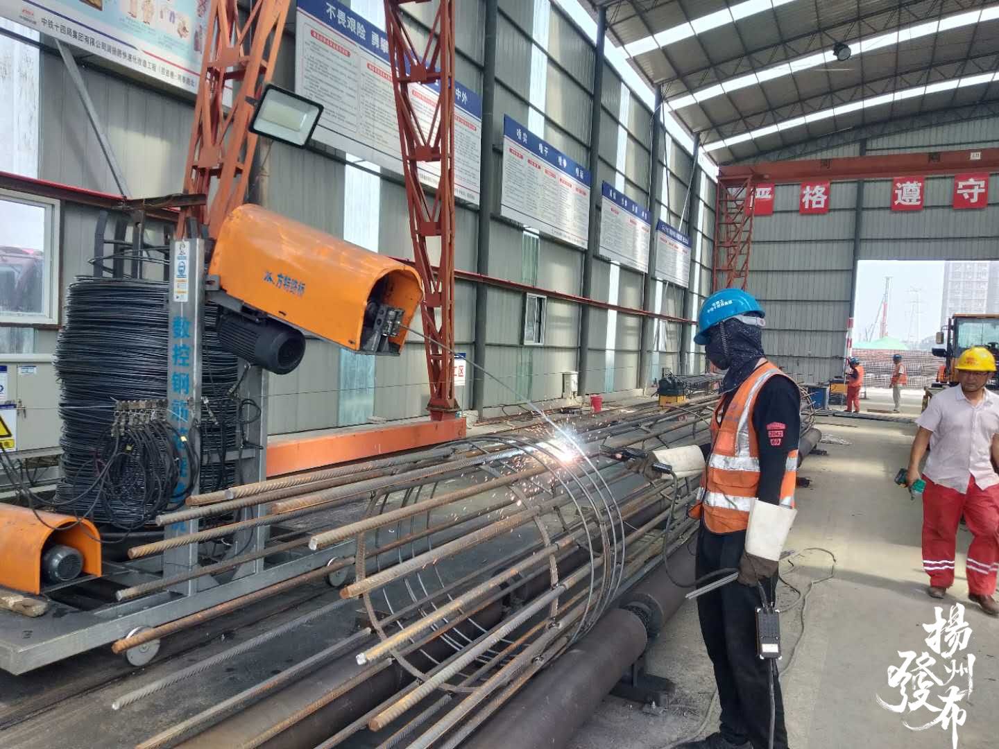 在润扬快速路三标段(同泰路北侧向南至百吉巷)百吉巷北侧,中铁十四局搭建的钢筋加工场内,工人们有的在设备上折弯钢筋,有的在焊接钢筋笼,为灌注桩建设提供材料。兴城西路南侧段面,一部大型旋挖钻机正在钻孔。其西侧不远处,新钻成的孔内放进了钢筋笼,一名焊工正在焊接。
