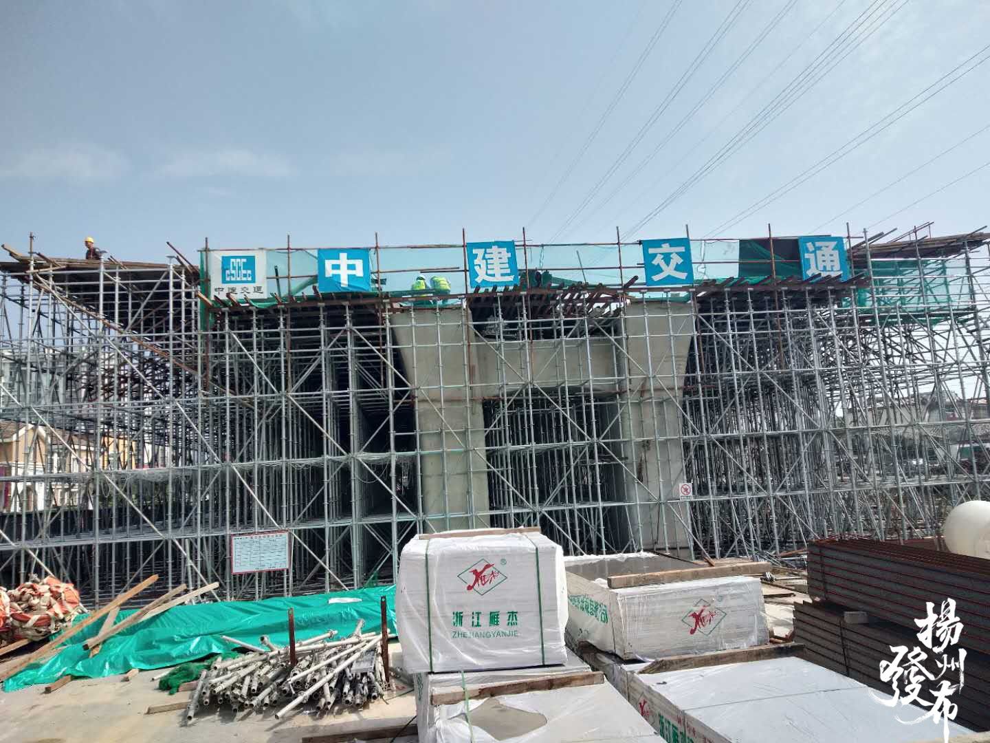 上午8时,记者在润扬快速路一标段(平山堂西路至翠岗路)最北端看到,第一联箱梁的脚手架已高高矗立,工人正在顶部立模板、绑扎钢筋,为箱梁浇筑做准备。中建交通项目总工刘涛介绍,预计下个月10日左右,第一联箱梁就将开始浇筑。这一箱梁为“单箱三室”,南北长62米,东西宽25米,顶板厚度25公分,底板厚度22公分,两板间距1.5米,整个箱梁净高7米左右,差不多两层楼高。该联箱梁约需混凝土1200立方米,相当于3000吨重。一标段主线共有13联箱梁,匝道共有箱梁6联,共需混凝土2.5万立方米。其中,跨翠岗路为钢箱梁,宽度39米,这段箱梁之所以不用混凝土浇筑,主要考虑这段箱梁比较宽,钢箱梁自重远小于混凝土箱梁,且受力比较好。一标段共需建设承台36个、墩身50个,目前已完成承台23个、墩身18个。