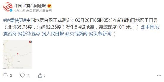 中国地震台网正式测定:06月26日05时05分在新疆和田地区于田县(北纬35.73度,东经82.33度)发生6.4级地震,震源深度10千米。