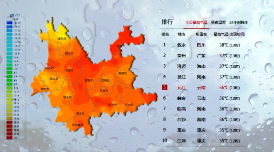 伴随降雨,多地还出现了高温天气,今天(6月26日)13时云南元江、彝良最高温36度登上全国高温排行榜第5、第6位,全省高温地区也较多。高温天气下,人体消耗增大,如果运动不当,容易造成伤害,需要注意防晒。