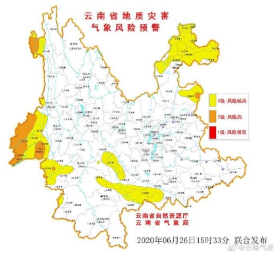云南气象台6月26日16时继续发布地质灾害气象风险橙色预警,预计6月26日20:00—6月27日20:00, 曲靖、怒江、德宏、保山及临沧部分地区发生滑坡泥石流等地质灾害的风险高(橙色);昭通、曲靖、怒江、德宏、保山、临沧、普洱及红河部分地区发生滑坡泥石流等地质灾害的风险较高。