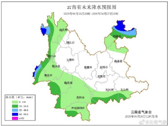 进入雨季,云南多地将持续强降雨天气,预计6月26日20时—6月27日20时:怒江北部、昭通北部、德宏西部阴有中到大雨局部暴雨,迪庆西部、怒江南部、保山西部、德宏东部、临沧西部、普洱南部、西双版纳、红河南部多云有小到中雨局部中雨,其他地区多云间晴局部有阵雨。