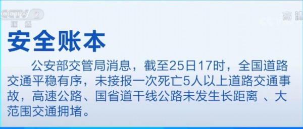 再来看安全账本。公安部交管局消息,截至25日17时,全国道路交通平稳有序,未接报一次死亡5人以上道路交通事故,高速公路、国省道干线公路未发生长距离、大范围交通拥堵。公安部交管局同时发出提醒,驾车出行要提前了解沿途天气和道路情况,雨天行车特别是在高速公路驾车要做到“降速、控距、亮尾”,遇道路拥堵依次排队通行,严禁争道抢行或占用应急车道。假期出游,合理安排行车时间和路线,全程系好安全带,注意劳逸结合,切勿疲劳驾驶,切勿酒后驾车。