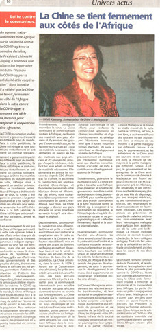 △驻马达加斯加大使杨小茸在马达加斯加主流媒体《午报》刊发署名文章《中国与非洲坚定站在一起》