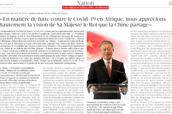 中国驻摩洛哥大使李立当地时间24日就中非团结抗疫特别峰会、中摩抗疫合作、北京新发疫情、中美关系以及疫后经济形势接受了摩洛哥发行量最大的法文报纸《晨报》专访。李大使在采访中表示,中非团结抗疫特别峰会是在中非双方抗击新冠肺炎疫情的重要时刻召开的一次重要会议,与会中非领导人就深入推进中非抗疫合作达成重要共识,充分体现了中非双方决心深化中非友好,加强相互支持,着力构建更加紧密的中非命运共同体的决心。