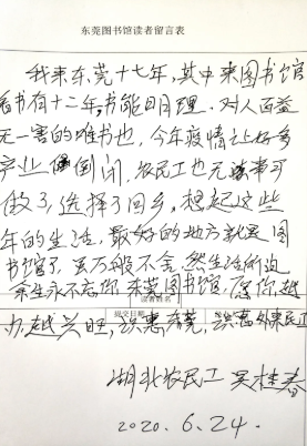 6月25日,在端午安康的节日祝福中,吴桂春留言东莞图书馆的话题被推上微博热搜榜,“我来东莞十七年了,其中来图书馆看书有十二年。……今年疫情让好多产业倒闭,农民工也无事可做了,选择了回乡。想起这些年的生活,最好的地方就是图书馆了。虽万般不舍,然生活所迫,余生永不忘你。……”一页图书馆留言簿上,写满了这位农民工读者对图书馆的不舍之情,简单而朴实的真情流露让无数人唏嘘。