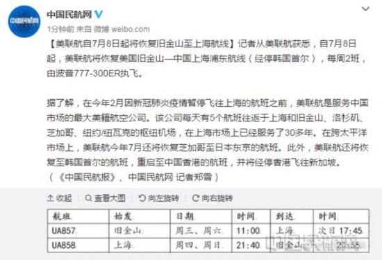 记者从美联航获悉,自7月8日起,美联航将恢复美国旧金山—中国上海浦东航线(经停韩国首尔),每周2班,由波音777-300ER执飞。
