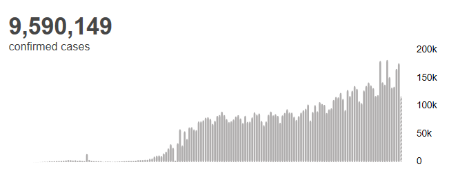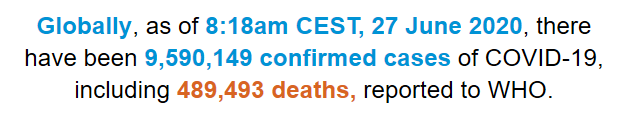根据世卫组织最新实时统计数据,截至欧洲中部夏令时间6月27日8时18分(北京时间6月27日14时18分),全球累计新冠肺炎确诊病例9590149例,累计死亡病例489493例。