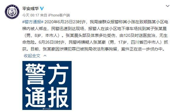 2020年6月25日23时许,我局接群众报警称其小孩在致顺路某小区电梯内被人绑走,民警迅速到达现场,报警人在该小区地下停车场找到其子张某晨(男,8岁,本市人)。张某晨头部及体表多处受伤,由120及时送医救治,无生命危险。6月26日0时许,民警将嫌疑人张某豪(男,17岁,四川省巴中市人)抓获。目前,张某豪因涉嫌犯罪已被我局依法刑事拘留,案件正在进一步侦办中。