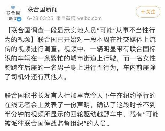 据联合国新闻官方微博28日凌晨消息:联合国已开始对一段本周在社交媒体上流传的视频进行调查。 视频中,一辆明显带有联合国标识的车辆在一条繁忙的城市街道上行驶,而一名女性骑跨在后座的一名男子身上进行性行为,车内前座除了司机外还有其他人。