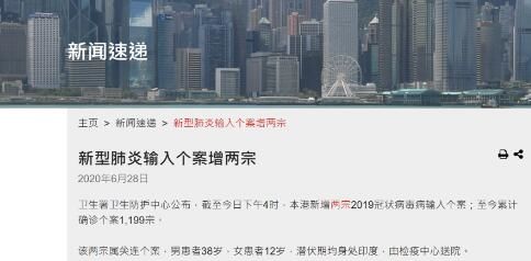 海外网6月28日电 据香港卫生署卫生防护中心消息,截至今日(28日)下午4时,香港新增2例新冠病毒输入个案,至今已累计确诊1199例。