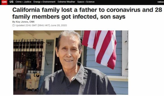 美国有线电视新闻网(CNN)28日报道称,美国加利福尼亚州一家庭至少28名成员感染新冠病毒,其中1人死亡。