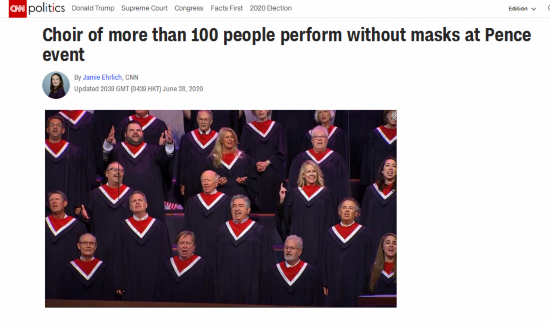 得克萨斯州新冠病例激增之际,美国副总统彭斯当地时间28日却前往得州一个教堂参加活动,不仅如此,多家美媒还注意到,活动中,100多名合唱团成员在唱歌时都不戴口罩。