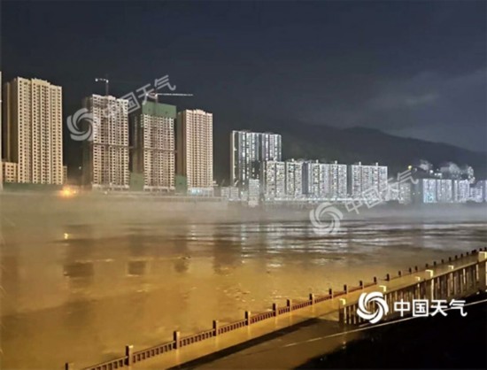 28日晚上,重庆武隆乌江涨水,县城滨江路部分路段被淹。(熊敏/图)
