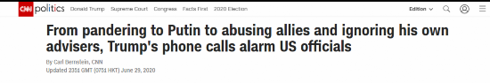 当地时间6月29日,CNN在网站头条发布题为“从迎合普京,欺凌盟友到忽视自己的顾问,特朗普的电话引起美国官员警觉”的文章(如下图),大曝特朗普“电话外交”的内幕,其中有很多惊人内容,比如“他时常攻击关键盟友领导人,尤其是女性领导人”,曾经在电话里骂德国总理默克尔和英国前首相特蕾莎·梅是“傻子”“愚蠢”,还特别受不了法国总统马克龙对他的“说教”,在和普京打电话时总是炫耀自己的成绩,像是希望得到对方某种认可,而往白宫打电话最多的外国领导人是土耳其总统埃尔多安,他一周至少打来两个电话,而特朗普在和他对话时总是表现出对中东历史问题的“无知”。