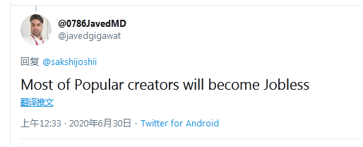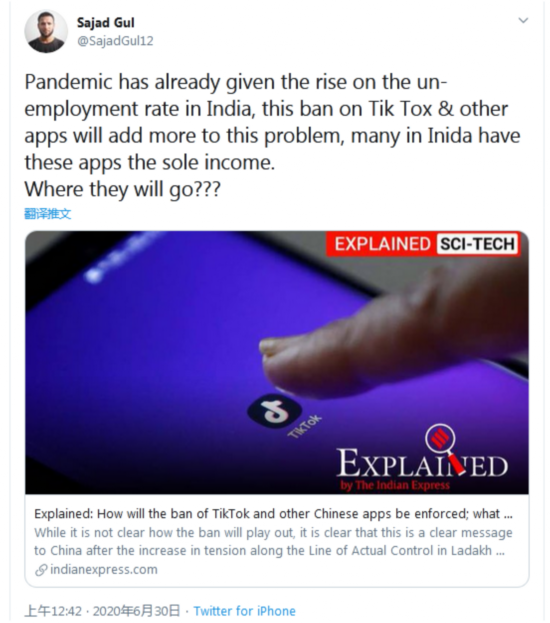 网友Sajad Gul:“疫情已经让印度失业率上升,针对TikTok以及其他应用的禁令将使(失业率)问题变得更加严重,许多印度人将这些应用作为唯一的收入来源。那他们以后要去哪儿?”↓