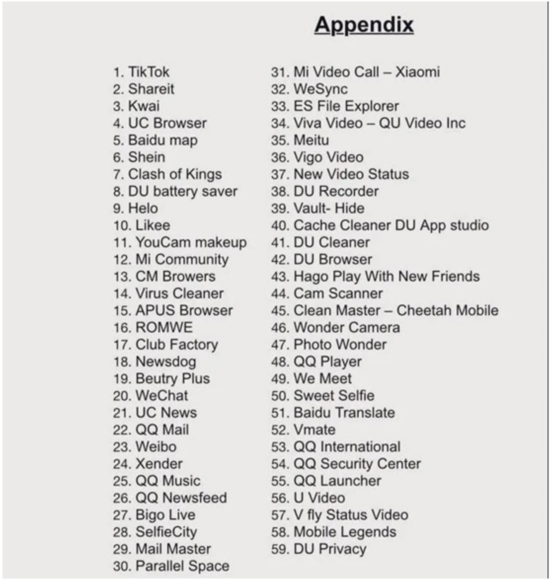 《印度时报》29日曾报道,印度政府当天在一份新闻稿中说,印度出于“安全”考虑,禁止包括TikTok、微信、微博在内的59款中国应用,认为这些应用从事的活动有损印度主权、国防、国家安全和公共秩序。