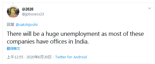 另一名印度网友评论,“由于这些(应用)公司在印度都设有办公室,将出现大规模失业。”↓