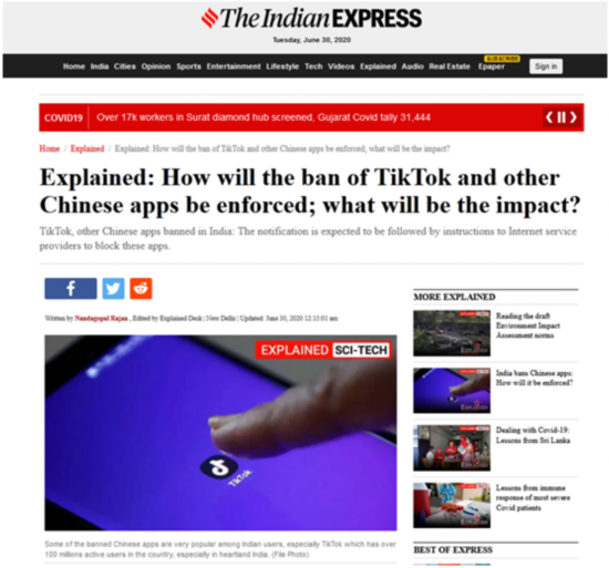 【环球网报道 记者 李东尧 丁洁芸】印度禁用包括TikTok在内的59款中国应用程序,也将伤及自身?在印度29日拿所谓“安全”理由说事宣布对中国APP的禁令引起巨大关注后,一些印度媒体开始关注到此举将造成的不利影响,其中《印度快报》就提及,这可能会让“在这些平台上搞创作与工作的印度人”失去收入来源和工作。