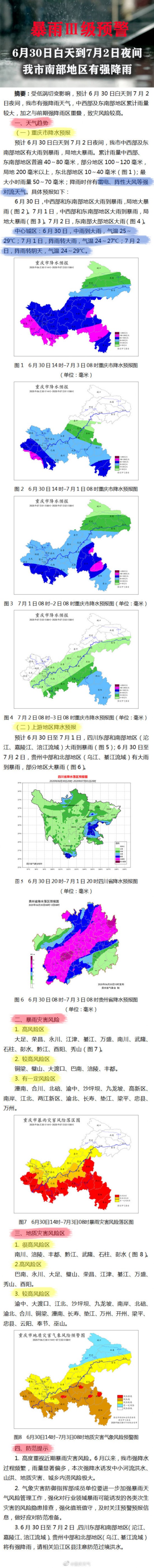 重庆市气象局发布暴雨Ⅲ级预警。预计6月30日白天到7月2日夜间,重庆市中西部及东南部地区有大雨到暴雨,局地大暴雨。累计雨量中西部、东南部地区普遍40~80毫米,部分地区100~120毫米,局地200毫米以上,东北部地区10~40毫米;最大小时雨量50~70毫米;降雨时伴有雷电、阵性大风等强对流天气。