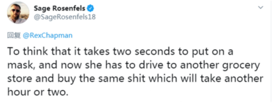 当然,也不乏网友对此感到困惑。“想象一下,戴上口罩只需要两秒钟,现在她不得不开车去另一家商店买同样的东西,这还需要一两个小时。”↓
