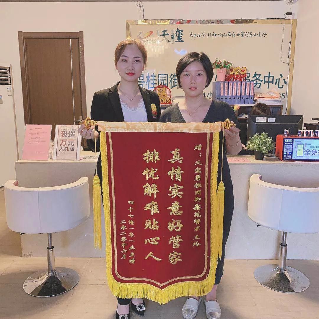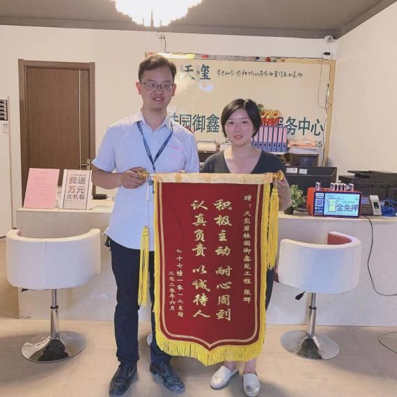 碧桂园服务江苏区域御鑫苑项目:御鑫苑47栋101业主代女士收楼以来有维修问题没有得到根治,很是困扰,见习管家王玲了解到情况后及时与工程领班张群及三方维修单位联系,并将实时跟进进度反馈业主,经过一段时间的紧密联系将问题解决,业主来验收后表示满意,并对碧桂园物业的服务点赞,特送上锦旗:真情实意好管家、排忧解难贴心人”,以示感谢与鼓励。