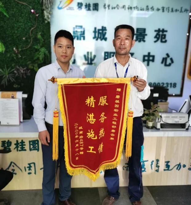 碧桂园服务江苏区域金双湖花园项目:金双湖花园业主肖先生长期在外地工作,平时很少回来,家里的装修都是委托给装修公司负责的,前几天管家装修巡查发现业主家楼上太阳能一直在漏水,于是立刻联系工程部过来关水,并联系太阳能师傅过来维修,避免产生不必要的损失。业主得知后,对管家的工作表示肯定,特意送来锦旗表示感谢,称赞物业管家“工作热情,认真负责”。