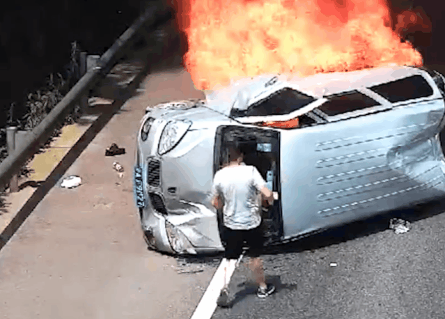 起火面包车旁边 不断有车辆高速驶过一名过路司机见状停车返回不停猛踹面包车前挡风玻璃