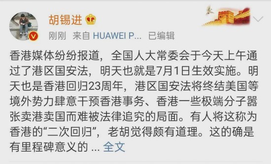 香港媒体纷纷报道,全国人大常委会于今天上午通过了港区国安法,明天也就是7月1日生效实施。明天也是香港回归23周年,港区国安法将终结美国等境外势力肆意干预香港事务、香港一些极端分子嚣张卖港卖国而难被法律追究的局面。有人将这称为香港的“二次回归”,老胡觉得颇有道理。这的确是有里程碑意义的历史节点。