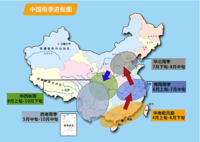 四到六月:华南地区进入前汛期;(当地的汛期分前后两段,前汛期发生在春天,是受副高影响,后汛期发生在七八月份,是受热带天气系统影响。)