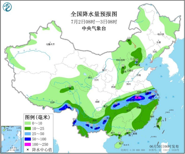 中央气象台预计,7月1日起,江南东部和北部、江汉南部、西南地区东部和南部、河北东北部、广西西部、西藏东南部、海南岛、台湾岛等地有中到大雨,其中,湖北南部、湖南北部、四川盆地东南部、贵州北部和西部、云南东北部、西藏东南部等地的部分地区有暴雨,局地大暴雨(100~130毫米)。