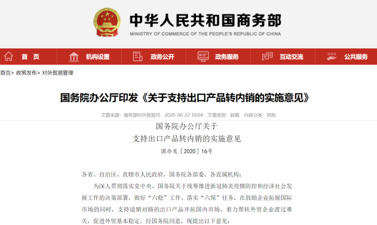 2020年6月30日下午,中华人民共和国商务部召开网上专题新闻发布会,介绍《国务院办公厅关于支持出口产品转内销的实施意见》(以下简称《实施意见》)的相关情况。