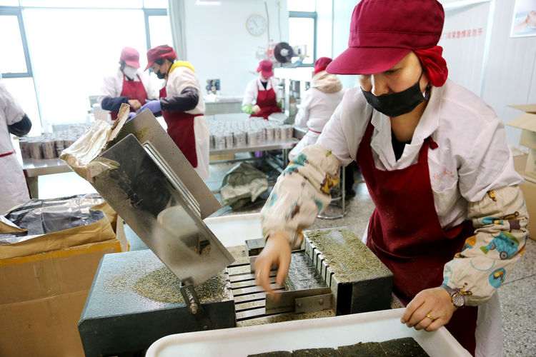 (2019年1月9日,江苏连云港,工人在连云区一家食品加工厂加工出口紫菜。)