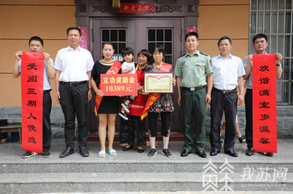 一人立功,全家光荣。伴随欢快的鞭炮声,高淳区退役军人事务局局长柳小兵为张金荣家人戴上“一人立功,全家光荣”的绸带,军地领导向张金荣母亲和妻子送上喜报并送上立功奖励金,现场还展示了军休干部曲卫猛的撰联“受阅三期人俊逸,欢谐满堂岁温馨”,对张金荣获得的荣誉表示祝贺,感谢张母傅红美将优秀的儿子送到部队建功军营,同时感谢张金荣妻子田晓林对丈夫工作的理解和支持,希望家人一如既往支持张金荣扎根边疆,再立新功,为家乡父老争光。