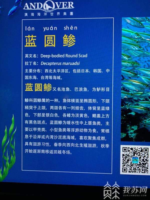 本次展出的是成年蓝圆鲹,体长在12到15厘米左右,身体主要呈现出银白色,因为鳃上方有一个蓝黑色的圆斑而得名“蓝圆鲹”。