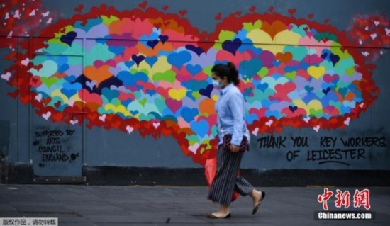 资料图:当地时间6月29日,英国莱斯特市中心,行人走过一幅为感谢疫情中做出贡献的工作人员而作的壁画。