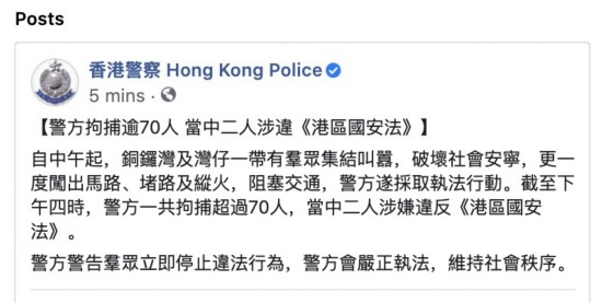 据香港警方官方脸书消息,自1日中午起,铜锣湾及湾仔一带有人群集结叫嚣,破坏社会安宁,更一度闯出马路、堵路及纵火,阻塞交通,警方遂采取执法行动。截至下午四时,警方一共拘捕超过70人,当中二人涉嫌违反香港国安法。警方警告群众立即停止违法行为,警方会严正执法,维持社会秩序。