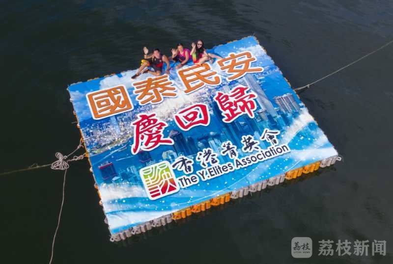 (香港菁英会在水中拉出“国泰民安 庆回归”的字样)