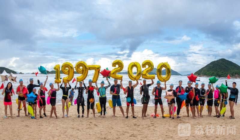7月1日,香港菁英会在浅水湾沙滩举办“青春活力共庆回归 碧海青天水中快闪”活动。不少香港青年齐聚浅水湾沙滩,举起“1997”及“2020”的气球拍摄,共同庆祝香港回归祖国23周年。