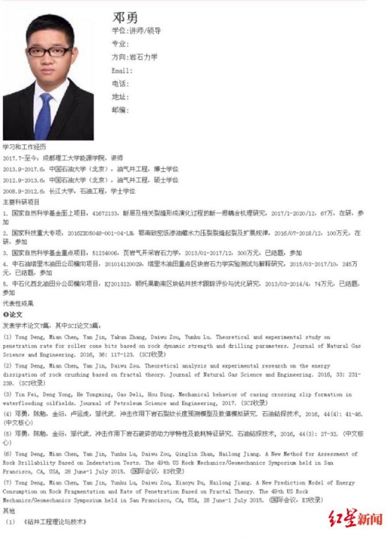 成都理工大学能源学院官网显示,邓勇为能源学院石油工程系讲师/硕导,自2017起在成都理工大学工作至今,发表学术论文7篇,其中SCI论文3篇。