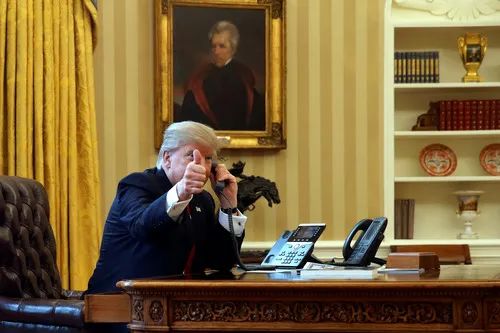 2017年1月29日,在美国首都华盛顿白宫,美国总统特朗普在打电话时竖起大拇指。新华社/路透