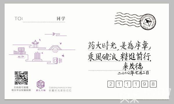 党委书记金能明,校长来茂德分别为7月2日当天和11月16日校庆日当天过生日的10位毕业生代表颁发毕业证书,拨穗正冠授予学位。虽然没能得到校长亲手授予的学位、亲自拨穗,但是药大的毕业生们发现,学位证书里还有惊喜——一张来茂德亲笔书写的明信片,上面写着校长的殷殷寄语:“药大时光,是为序章;乘风破浪,精进前行”, 明信片的左下角还有一个二维码,扫一下就是校长为每一位2020届毕业生送上了时长达1分42秒的毕业祝福。