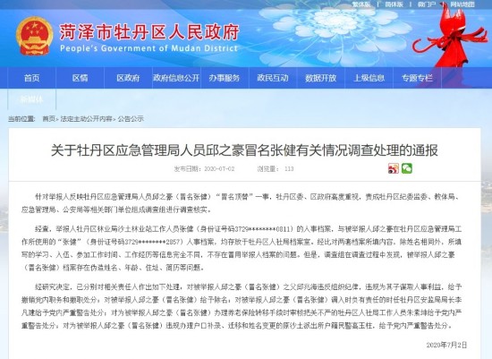 荔枝新闻讯 7月2日,菏泽市牡丹区人民政府网站发布《关于牡丹区应急管理局人员邱之豪冒名张健有关情况调查处理的通报》。