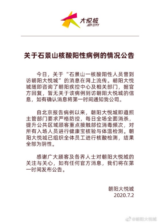 自北京报告病例以来,朝阳大悦城即遵照主管部门要求严格防控,每日全场全面消杀,提升公共区域顾客重点接触部位消毒频次,对所有入场人员进行健康宝核验与体温检测。朝阳大悦城已组织全体员工进行核酸检测,结果全部为阴性。