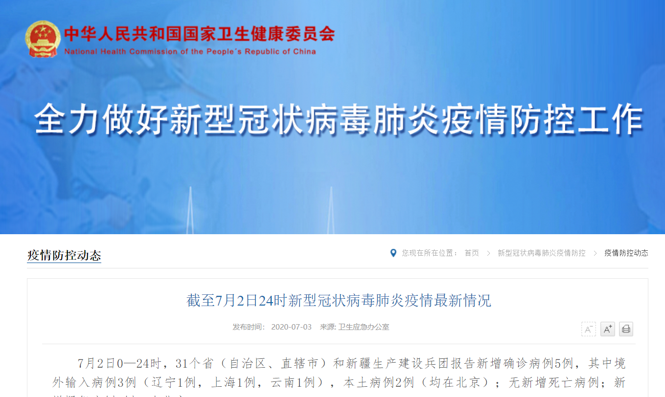 据国家卫健委官网消息,7月2日0—24时,31个省(自治区、直辖市)和新疆生产建设兵团报告新增确诊病例5例,其中境外输入病例3例(辽宁1例,上海1例,云南1例),本土病例2例(均在北京);无新增死亡病例;新增疑似病例1例,在北京。