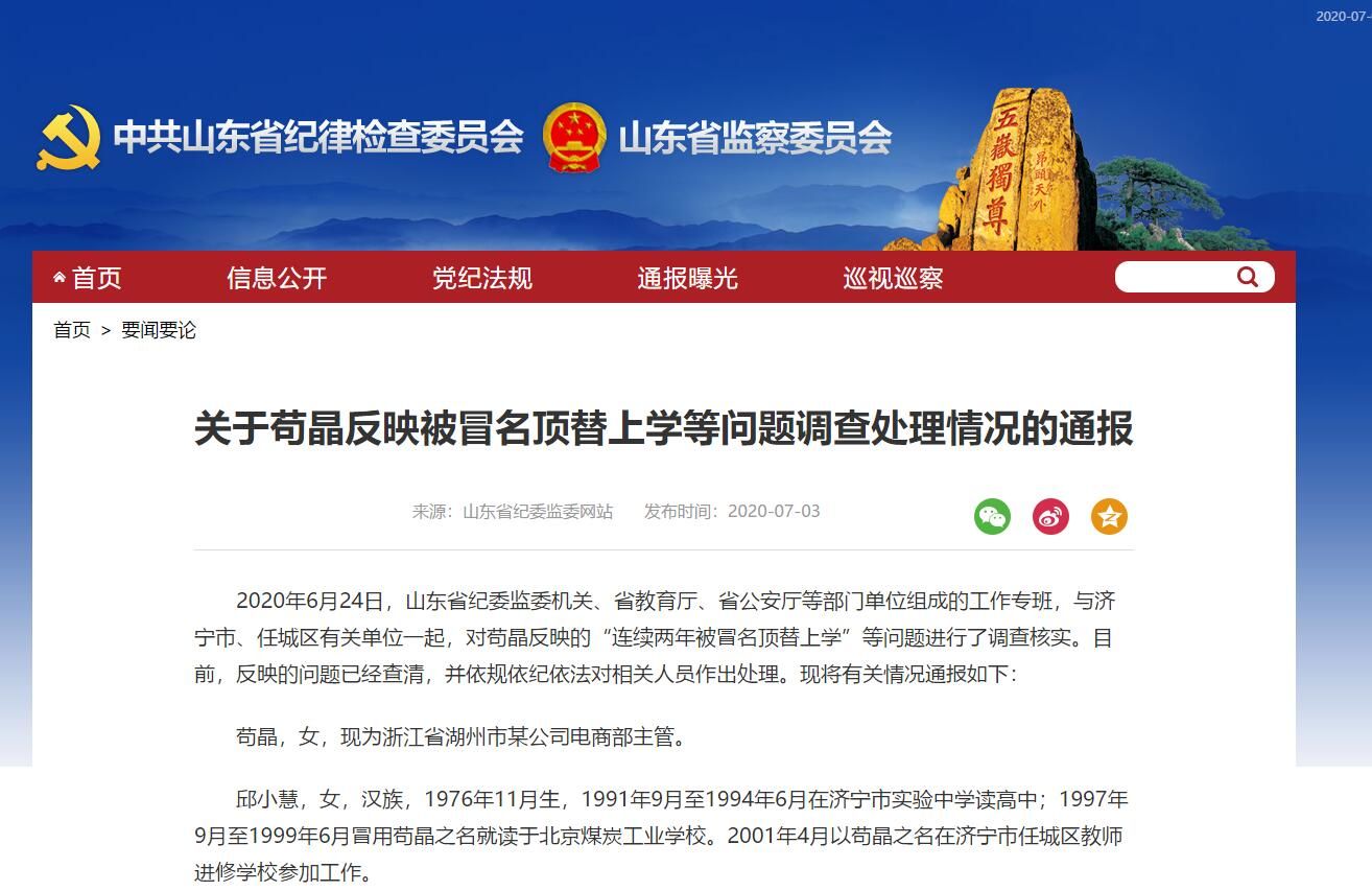 荔枝新闻讯 7月3日,山东省纪委监委网站发布了《关于苟晶反映被冒名顶替上学等问题调查处理情况的通报》,全文如下: